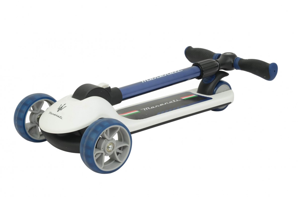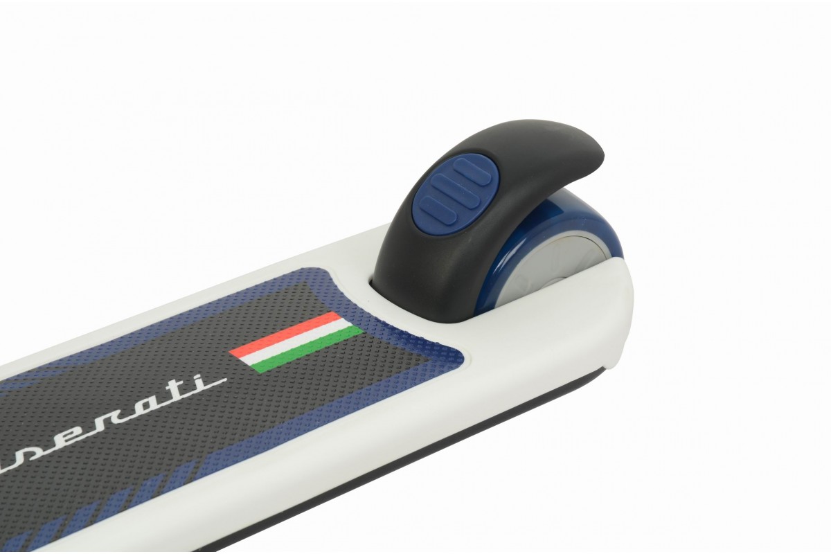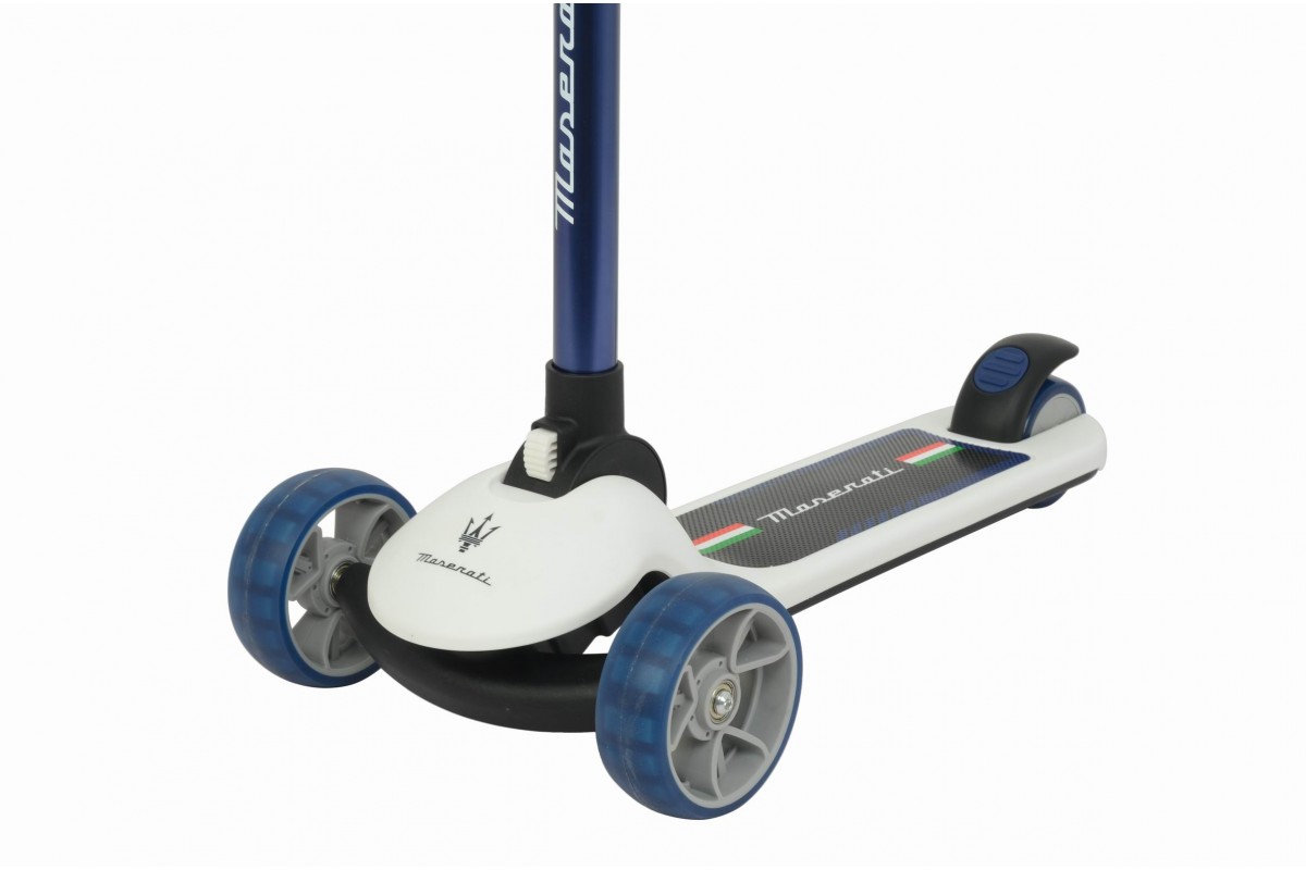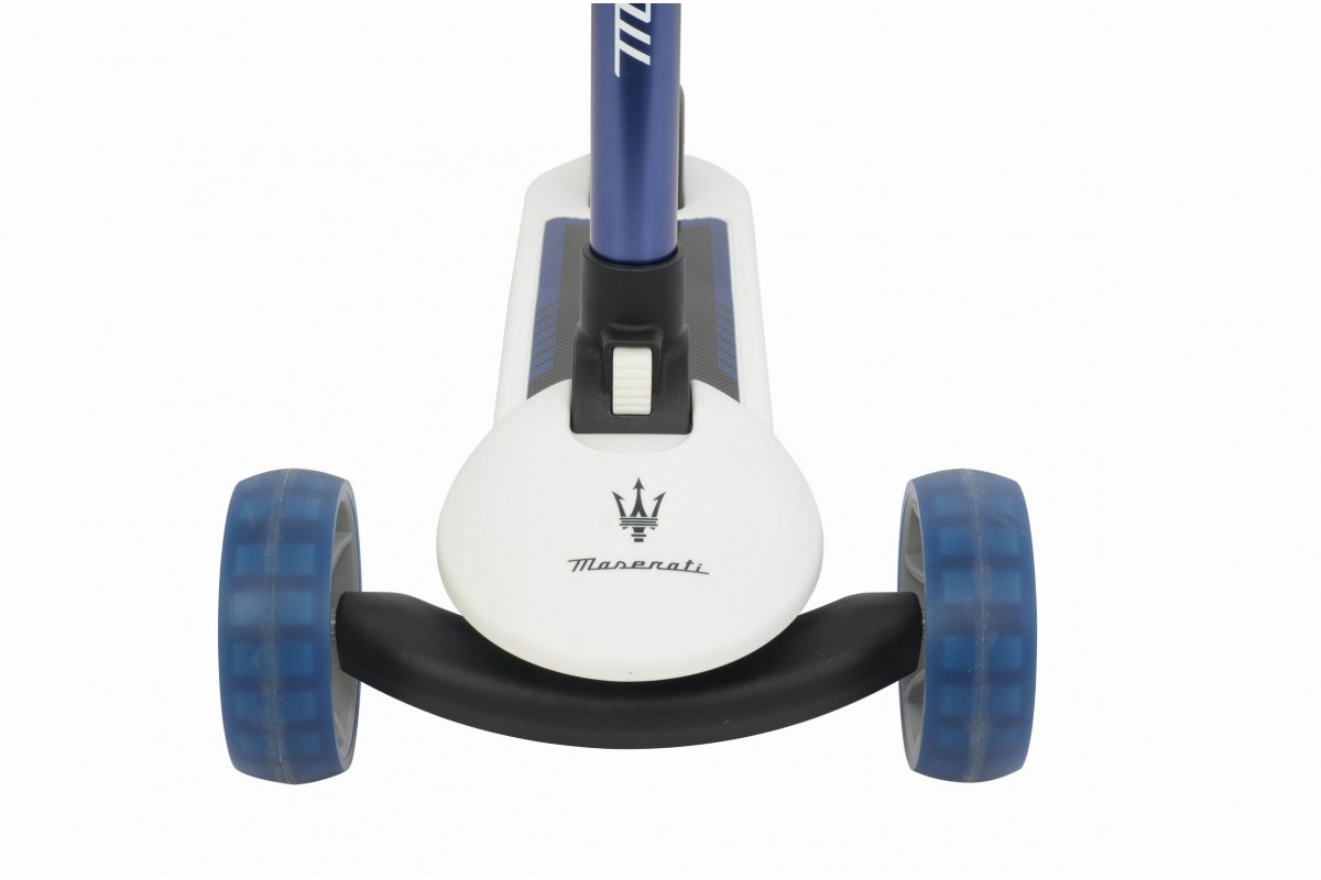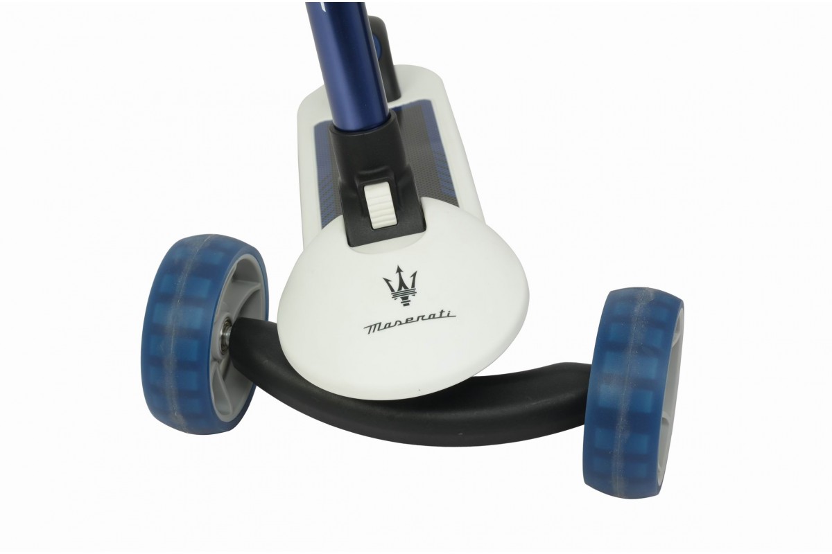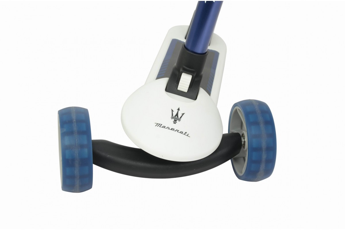 Трехколесный беговел-самокат Maserati с сиденьем - CLB-0140-WHITE - это трехколесный самокат по лицензии компании Maserati с сиденьем, алюминиевым рулем и со светящимися колесами - все, что необходимо для активного отдыха ребенка! Специальная модель трехколесного самоката с сиденьем создана для детишек от 1 года. Модель представляет собой самокат-беговел для малышей, которые только начинают осваивать чудо-технику самокат. Принцип езды на таком самокате такой же, как у беговелов, то есть сел, отталкиваешься двумя ногами и едешь. Сиденье самоката может быть зафиксировано в любой точке рулевой стойки, что позволяет настраивать самокат на различной высоте по мере роста Вашего малыша. А, начиная примерно с 2,5 лет сиденье можно снять и делается это буквально в одно действие, что очень удобно. Контроль за скоростью обеспечит ножной тормоз над задним колесом. А для яркой и запоминающейся езды самокат имеет светящиеся LED колеса нового поколения - светятся снаружи и внутри колеса.