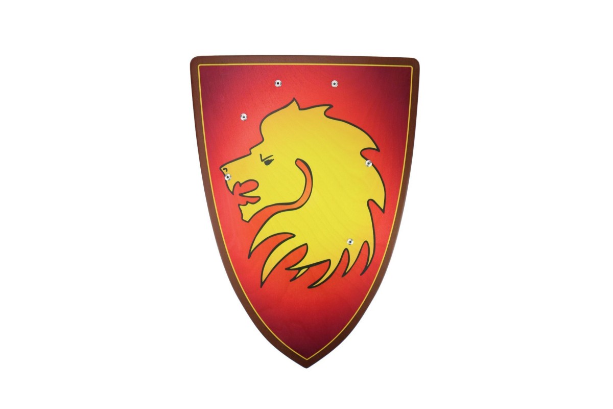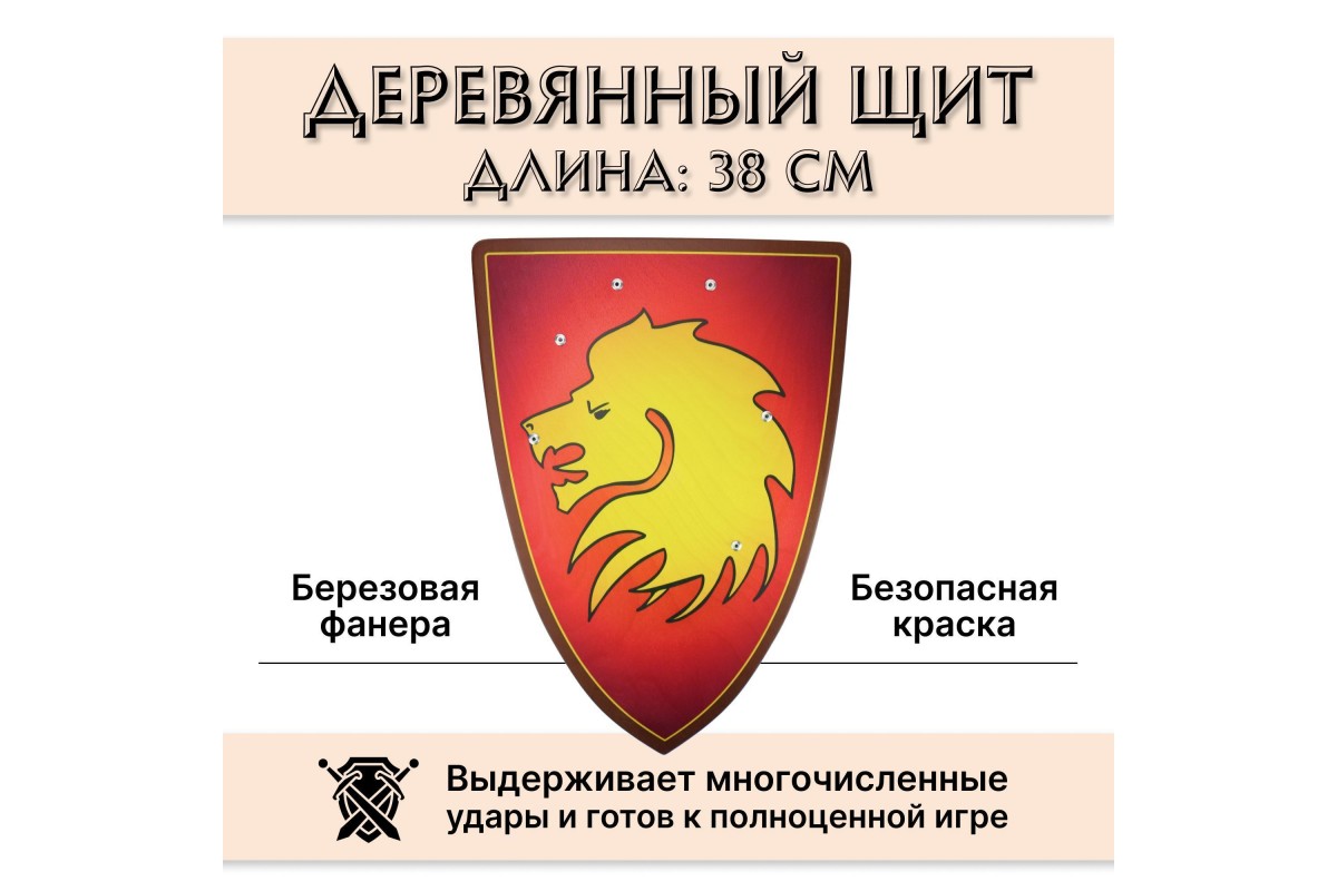 Детский щит треугольный изготовлен из березовой фанеры с рукояткой из натуральной кожи. Отшлифован и покрашен. Не имеет заусенцев и готов к игре. В ассортименте различные изображения. Размеры щита: Фанера 4 мм, Высота 38 см, Ширина 25 см, кожа