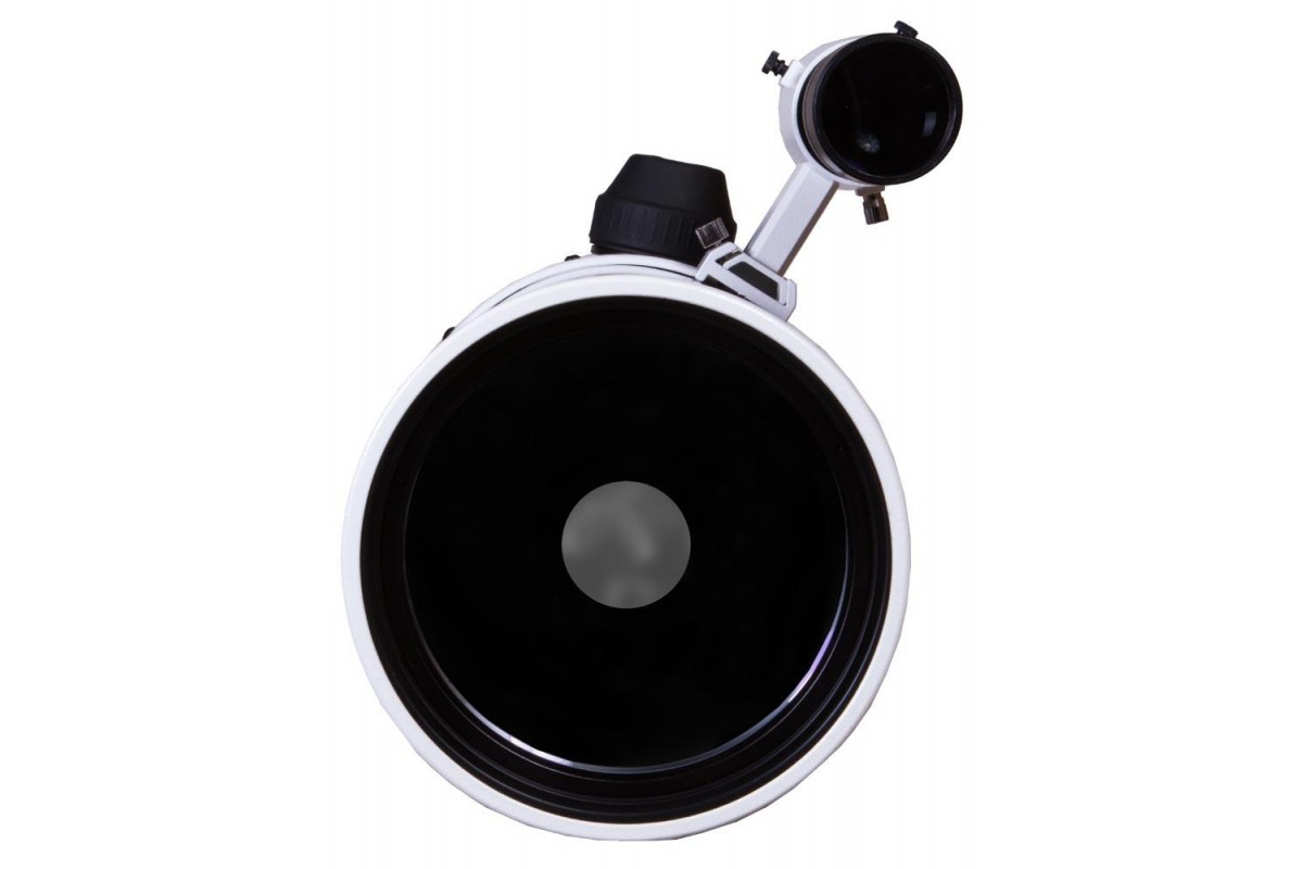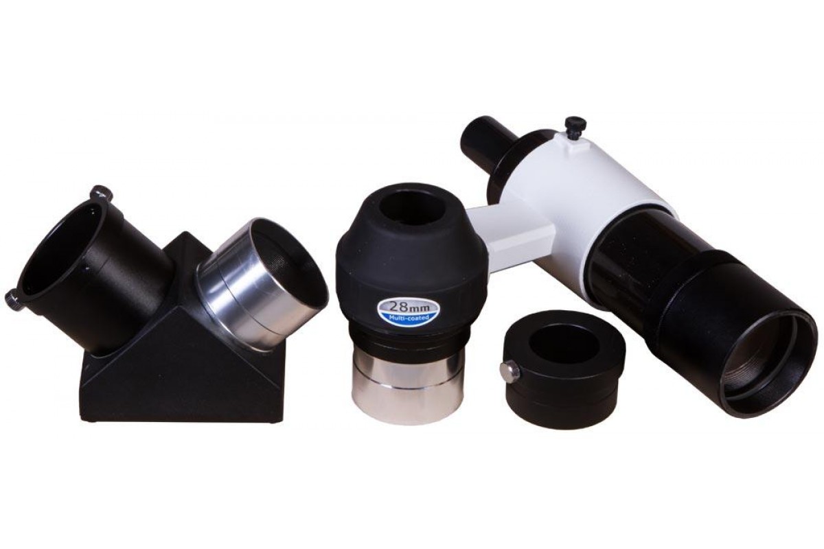 В комплект поставки уже включен окуляр LET 28 мм. Он позволит рассматривать объекты Солнечной системы при кратности в 63х. Поле зрения среднее, но достаточное для изучения крупных объектов. Для наблюдений за околозенитной областью труба комплектуется диагональным зеркалом 90°. Оно будет удобно и при изучении земных ландшафтов, так как делает картинку неперевернутой (исправляет зеркальное отражение по вертикали). В комплекте вы найдете и оптический искатель 9х50.