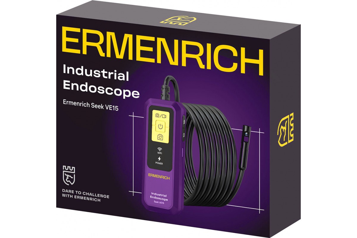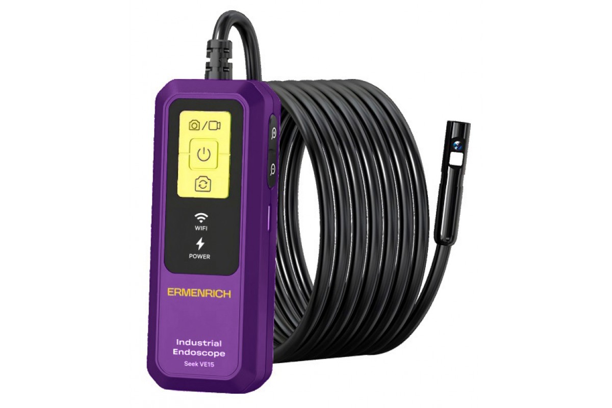 Видеоэндоскоп Ermenrich Seek VE15 – цифровой промышленный инструмент, который используется для проверки скрытых коммуникаций, технических полостей в стенах и шахт вентиляций при оценке качества строительных работ и ремонта и поиске очагов плесени, влажности и промерзания. Его кабель, являющийся частью рабочего зонда, имеет длину 10 метров и отличается гибкостью. На конце кабеля расположены две камеры – фронтальная и боковая. Фронтальная камера имеет угол обзора 70°, вокруг нее собраны 8 светодиодов для дополнительной подсветки в темных местах. Боковая камера имеет угол обзора 78° и 1 светодиод. Фокусное расстояние фронтальной камеры составляет 20−100 мм, боковой − 20−50 мм. За формирование изображения в устройстве отвечает качественный CMOS-сенсор.