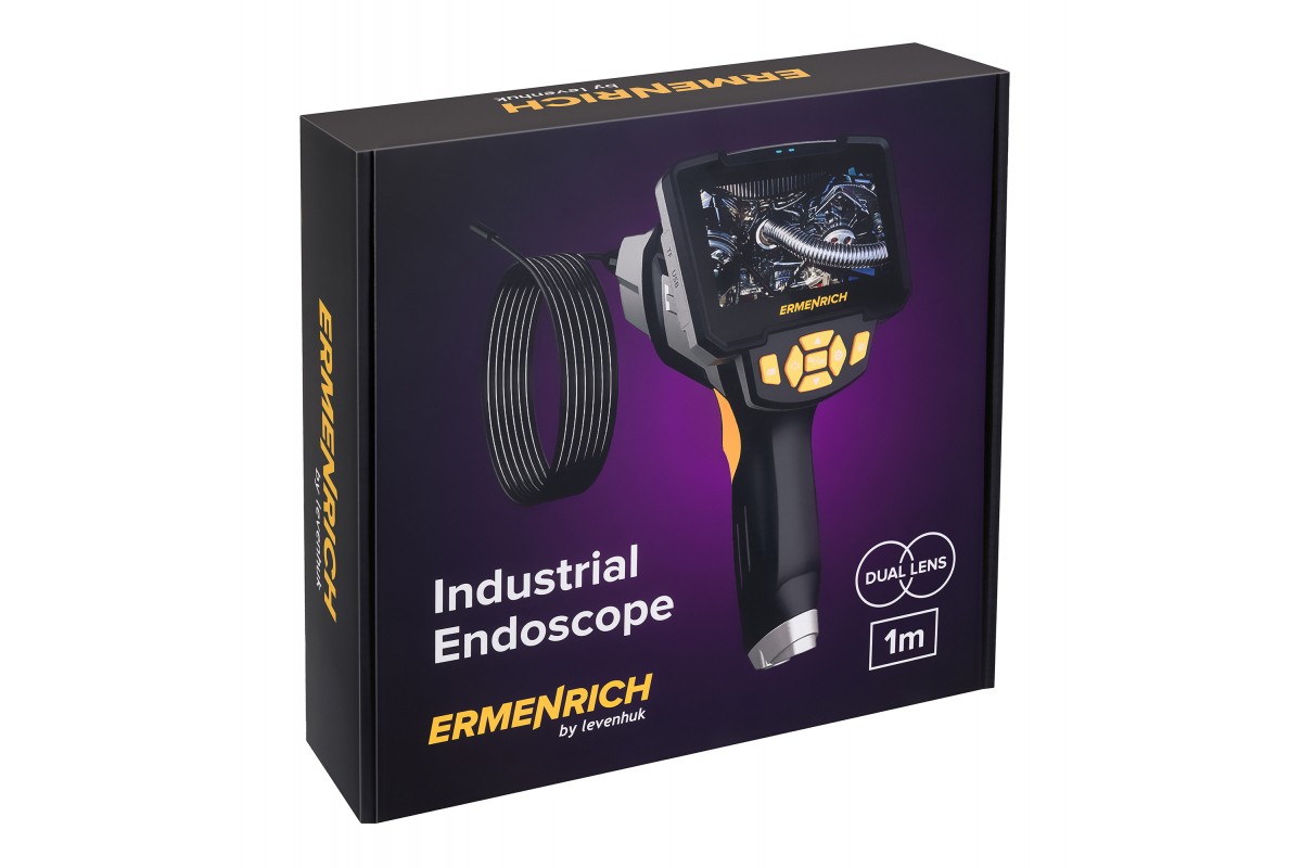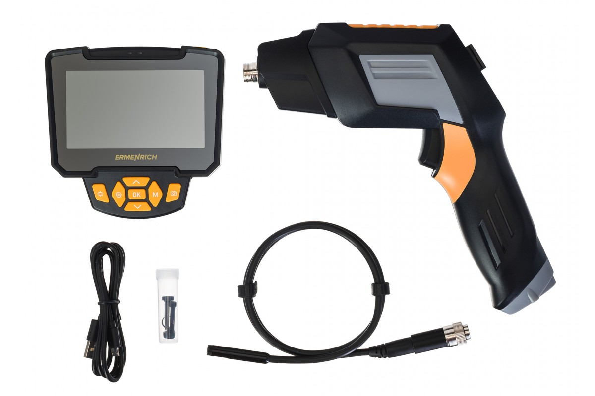 Устройство для осмотра трудноступных мест трубопроводов, кабельных линий, промышленного оборудования. Бороскоп Ermenrich Seek VE60 оснащен полужестким кабелем длиной 1 м и цветным дисплеем с диагональю 4,3". У этой модели две камеры – одна фронтальная и одна боковая – для съемки фото (разрешение 1280x720 пикс) и видео (640x480 пикс). Камера имеет угол обзора 70° и дает четкое изображение благодаря светодиодной подсветке. Степень герметичности камеры IP67, ее можно погружать в воду.