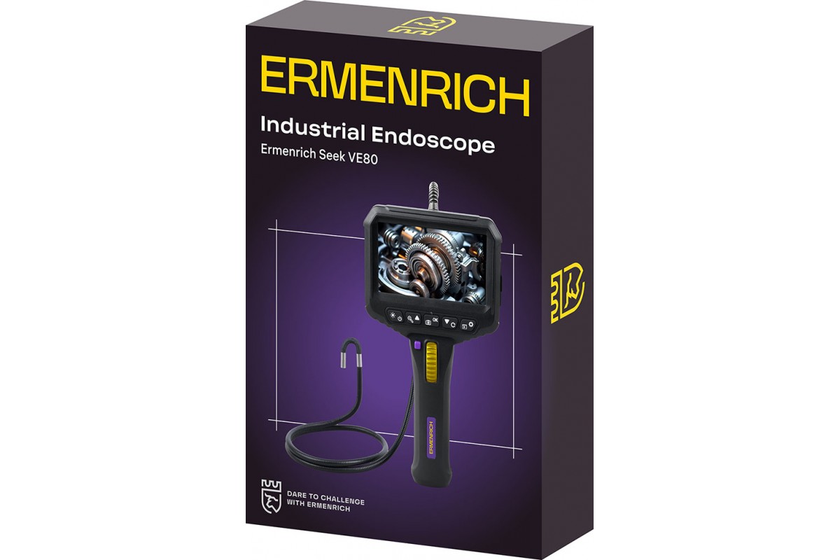 Видеоэндоскоп Ermenrich Seek VE80 был создан для облегчения контроля качества строительства и монтажа коммуникаций (труб, вентиляционных шахт, дымоходов, электропроводки и т. д.), особенно в труднодоступных и темных местах, застенных пространствах и полостях. Исследование интересующей области проводится при помощи специального зонда, состоящего из кабеля длиной 3 метра и 1 поворотной камеры, расположенной на его конце.