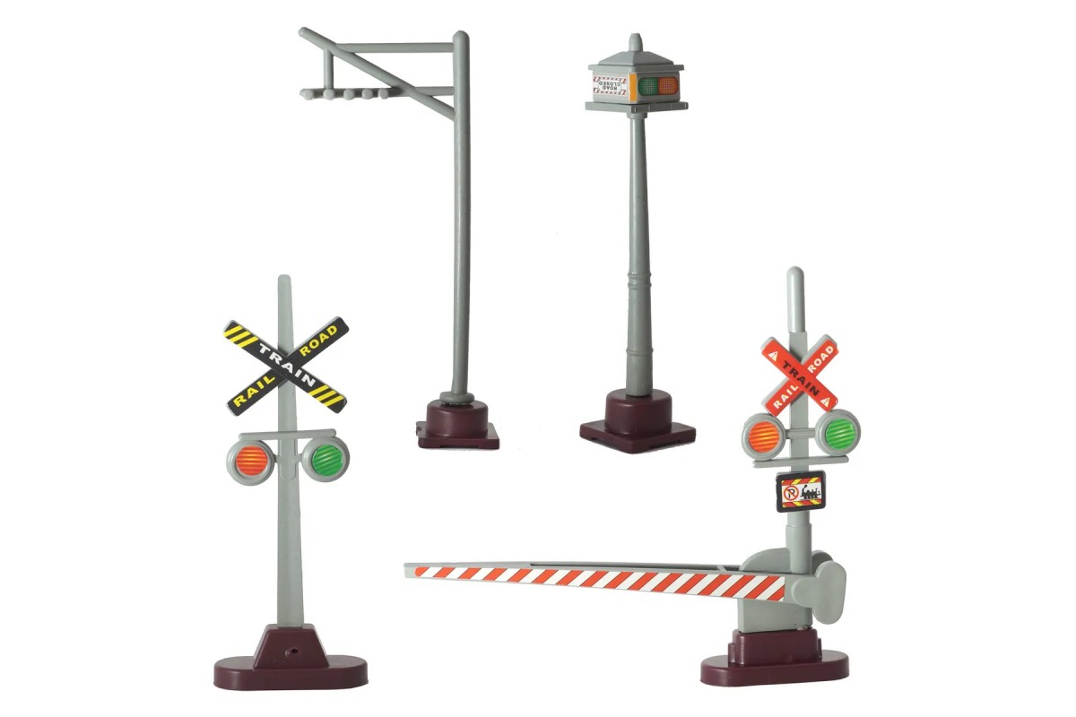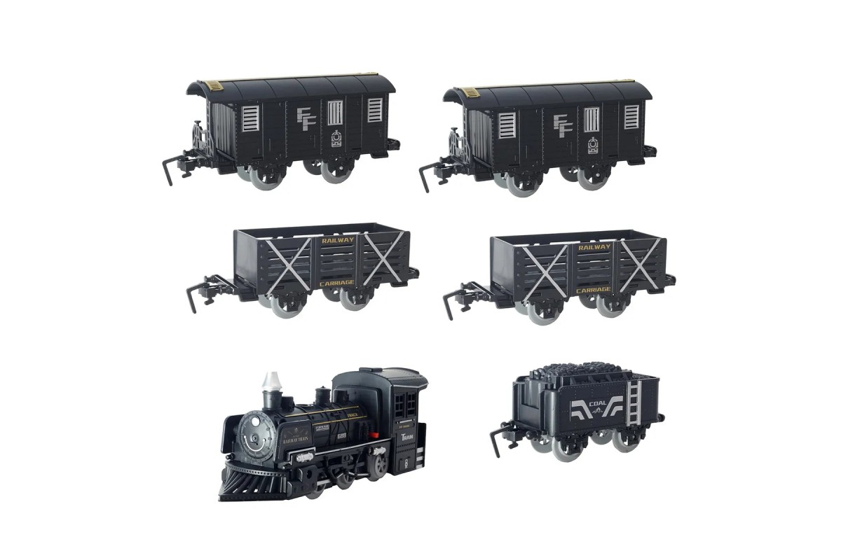В набор входит: 1 паровоз, 5 грузовых вагонов, 4 комбинированных рельсов (прямые с изгибом), 1 перекрестный рельс, 10 изогнутых рельсов, 4 длинных прямых рельсов, 8 коротких прямых рельсов, 2 дерева, 4 дорожных знака, 1 резервуар для воды.