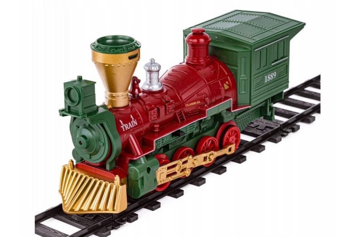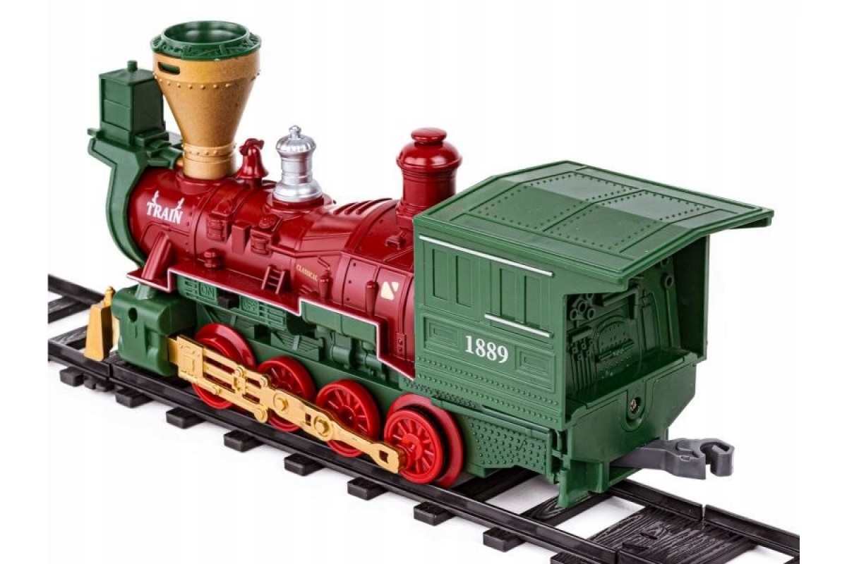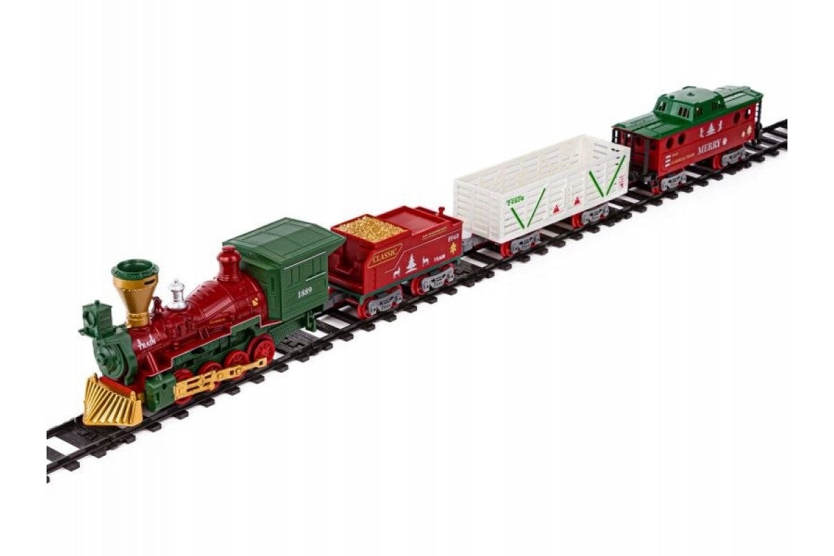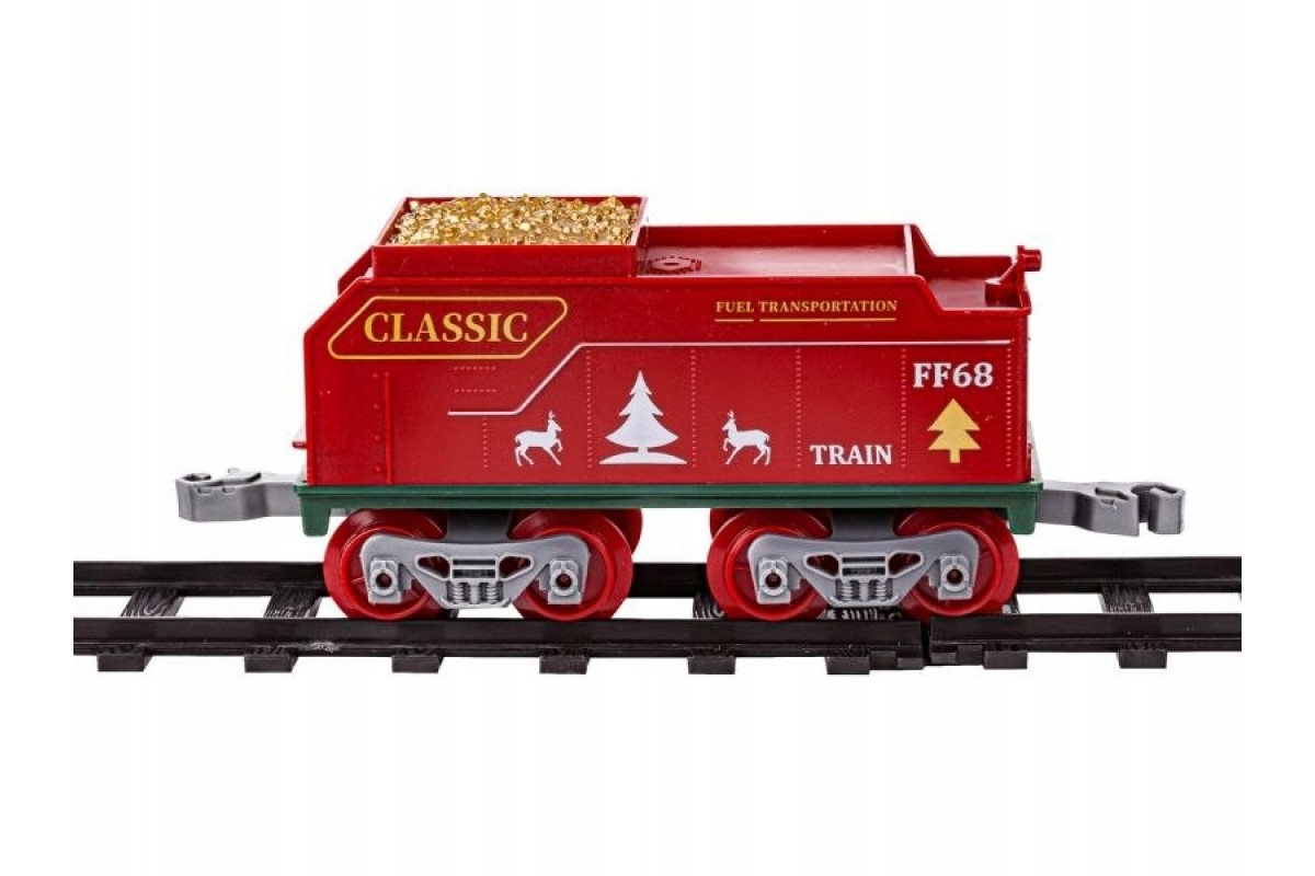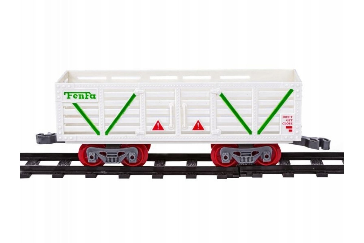Комплект поставки: локомотив, вагонетка с углем, вагон-рефрижератор, вагон-хоппер, железнодорожное полотно (18 сегментов), железнодорожные знаки, деревья, емкость для воды