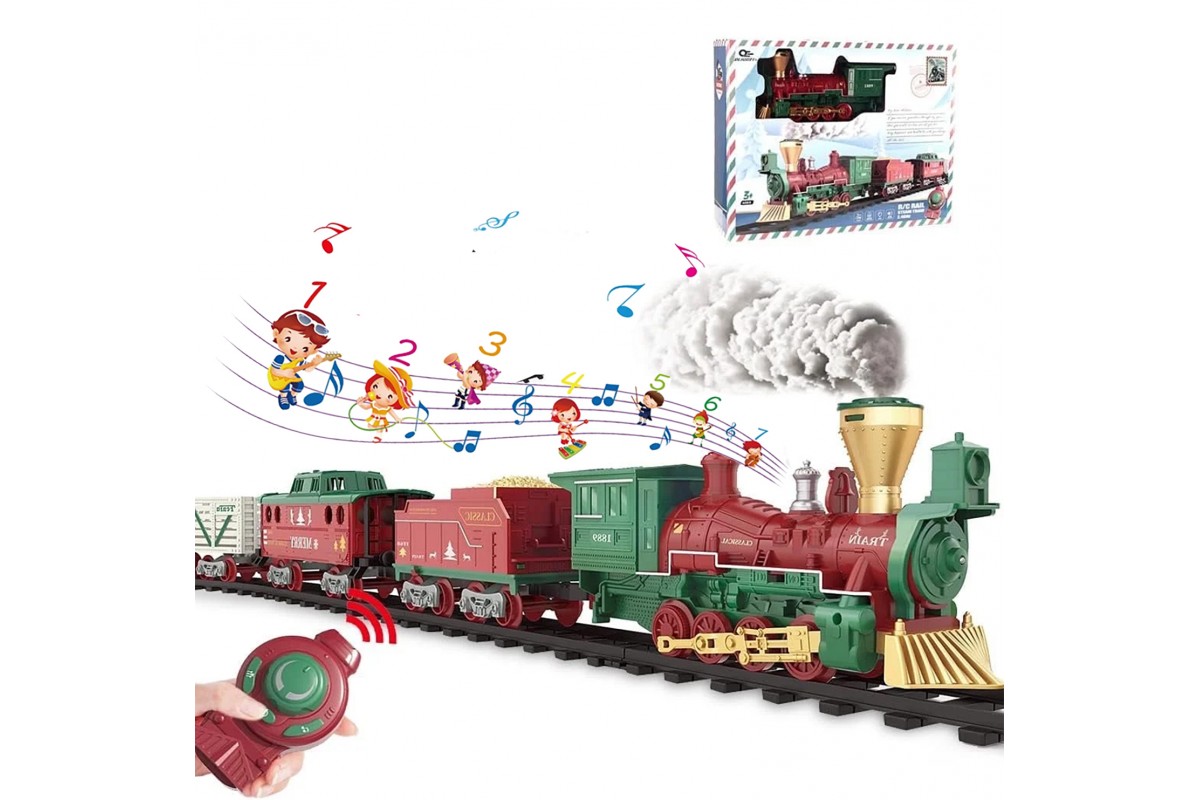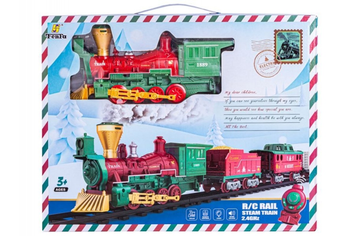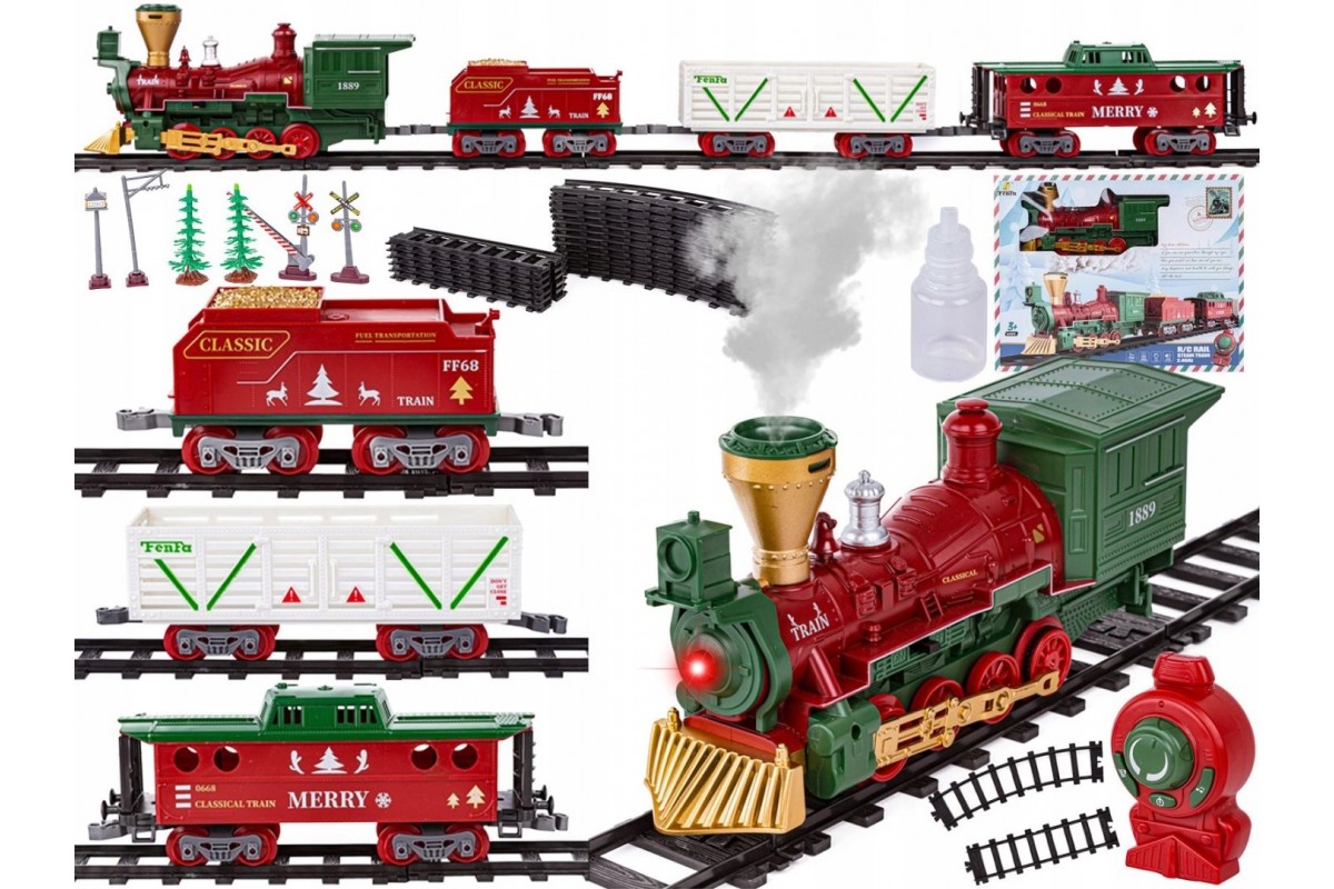 Железная дорога Новогодний поезд Fenfa (3 вагона, пар, пульт, свет, звук) - 1613F – это увлекательная игра, которая не только займет вашего малыша на долгое время, но и принесет много пользы. Набор включает в себя реалистичный поезд на пульте управления, дорожные знаки, елочки и множество интересных деталей. Оборудованный светящимися сигнальными огнями, поезд может двигаться даже в темноте. Он также пускает пар и издает звуки настоящего поезда. Саму железную дорогу можно собирать по-разному, создавая уникальные и интересные маршруты.