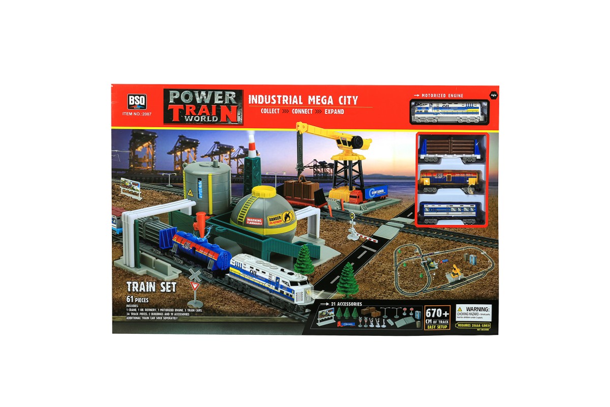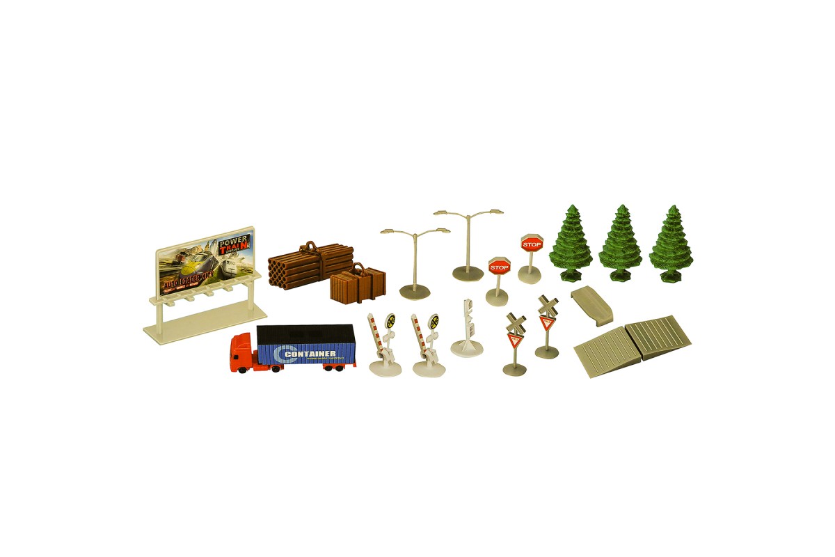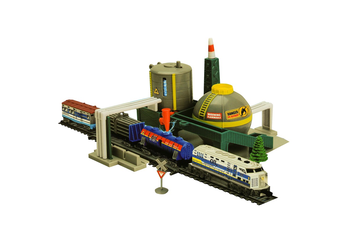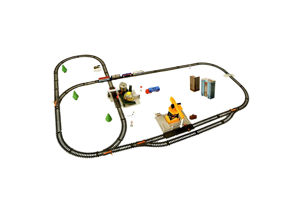 В набор входит: 1 головной вагон, 3 грузовых вагона, рельсы, станция загрузки воды и контэйнеров, элементы декора
