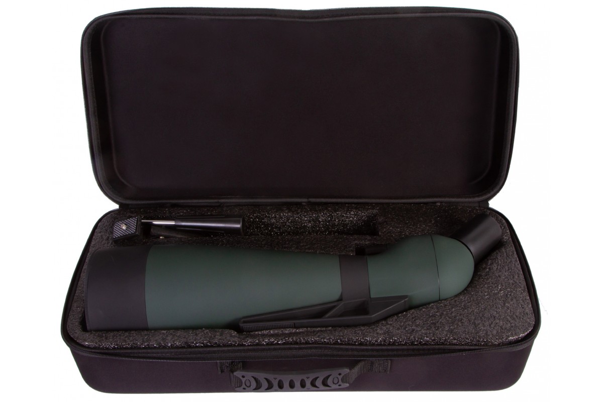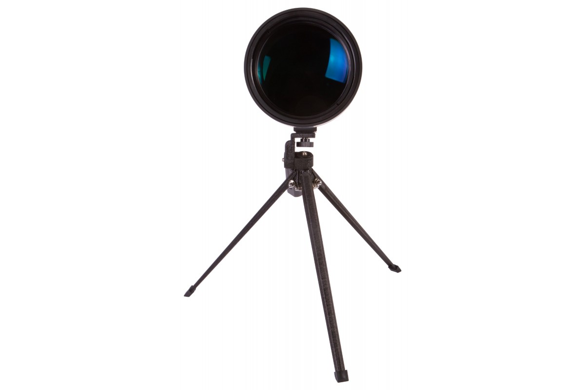Корпус зрительной трубы сделан из пластика. Есть стандартное резьбовое крепление 1/4 дюйма, поэтому Levenhuk Blaze BASE 100 можно устанавливать на штатив. В комплект поставки включен небольшой металлический штатив, а также жесткий кейс для переноски и хранения.