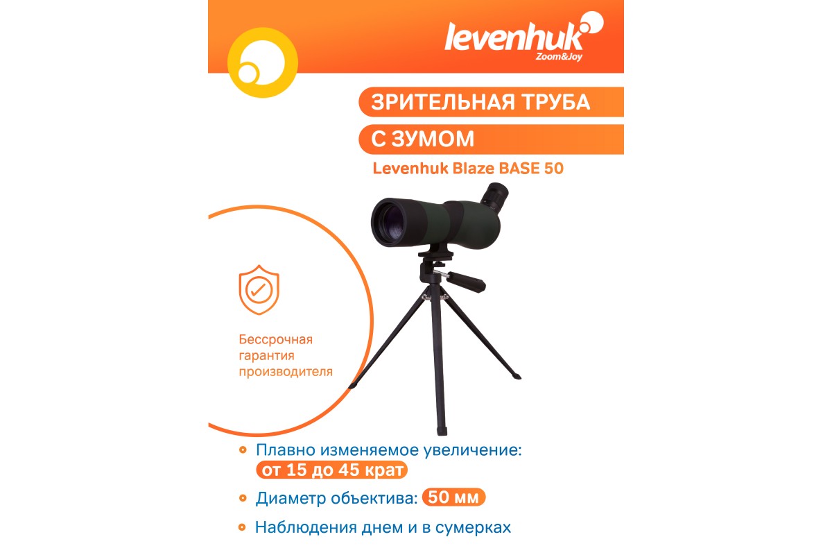 Levenhuk Blaze BASE 50 – зрительная труба с панкратическим объективом. Вы сможете плавно изменять увеличение в диапазоне от 15 до 45 крат. Этот оптический прибор прекрасно подойдет для наблюдений за животными и птицами, изучения городских ландшафтов и отдельных построек.