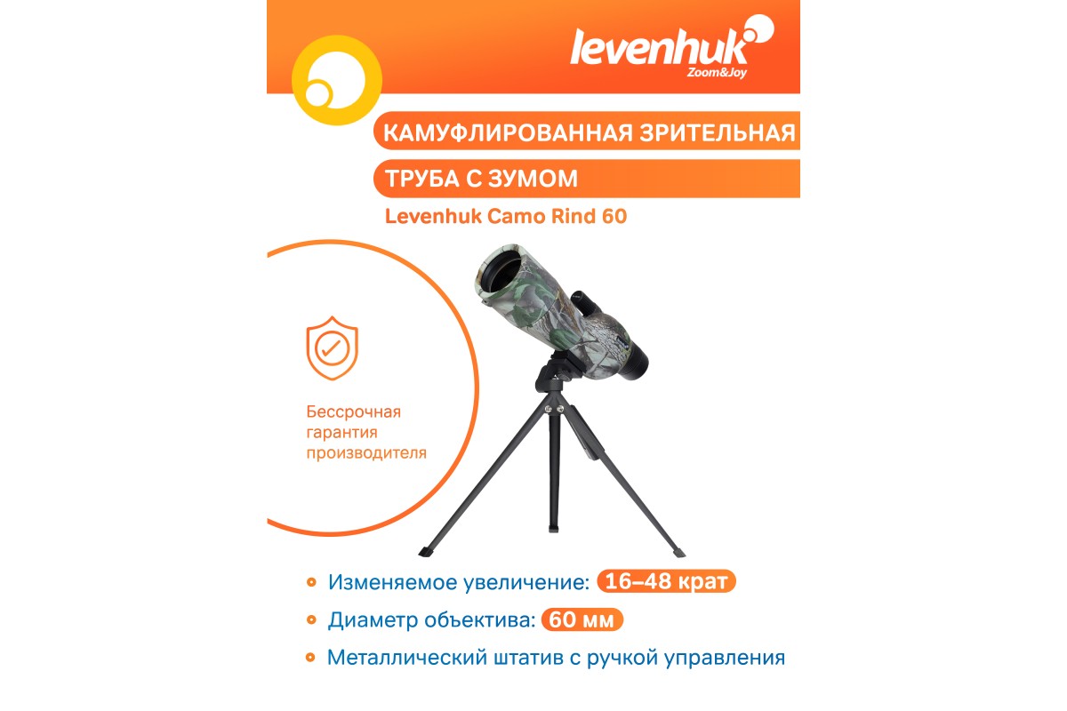 Зрительная труба Levenhuk Camo Rind 60 – надежный и функциональный оптический инструмент для наземных наблюдений. Она идеально подойдет для охоты и изучения городских ландшафтов. Модель не имеет излома оптической оси – можно вести наблюдения сверху вниз, например, с крыши здания или с края обрыва. Труба укомплектована миниатюрным штативом из металла, который оснащен удобной ручкой наведения.