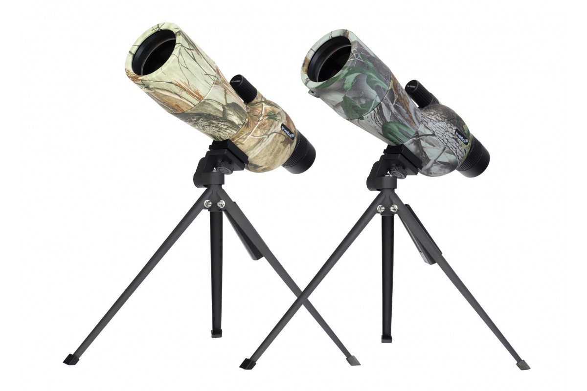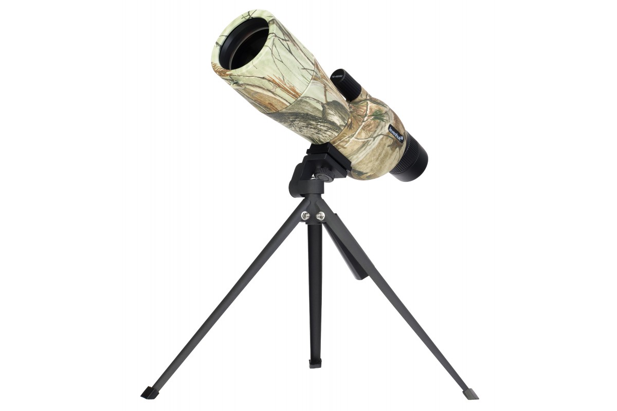 Корпус модели произведен из долговечного ABS-пластика. Защитить оптику от водных брызг и пыли помогает внешнее резиновое покрытие. Труба выполнена в камуфляжной расцветке – оптический прибор не демаскирует наблюдателя. Для комфортных продолжительных наблюдений вместе с прибором поставляется миниатюрный металлический штатив с ручкой наведения.