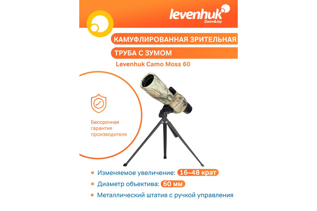 Универсальный оптический инструмент для активного отдыха – зрительная труба Levenhuk Camo Moss 60. С ее помощью можно любоваться панорамой местности или детально рассматривать удаленные объекты – увеличение регулируется в пределах от 16 до 48 крат. Чтобы изменить кратность, не нужно отрываться от наблюдений – достаточно повернуть специальное кольцо на окуляре. Эта модель – идеальное решение для охоты, охраны и спортивных игр.