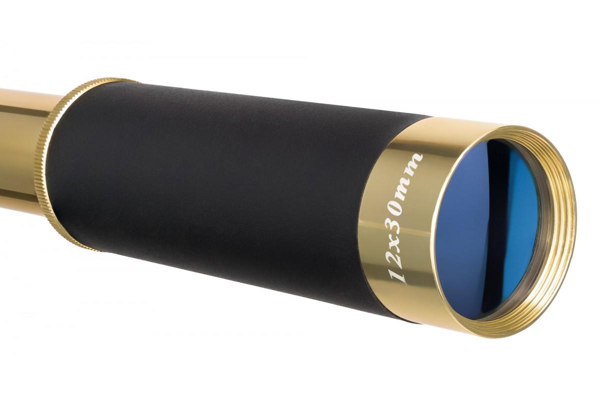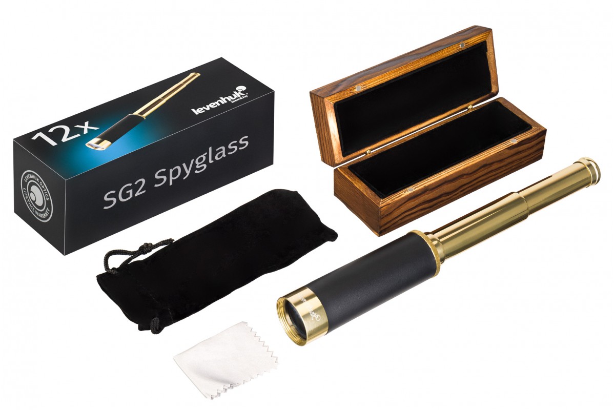 Levenhuk Spyglass SG2 – это зрительная труба с раздвижным корпусом, которая внешне повторяет старинные подзорные трубы. Ее корпус сделан из латуни и покрыт кожей в основной части. Оптика стеклянная и отлично передает все красоты окружающего мира. Кратность трубы составляет 12х, что позволяет детально рассматривать природные ландшафты, городские пейзажи, животных, птиц и сильно удаленные объекты. Светосильная оптика подходит для наблюдений при слабой освещенности.